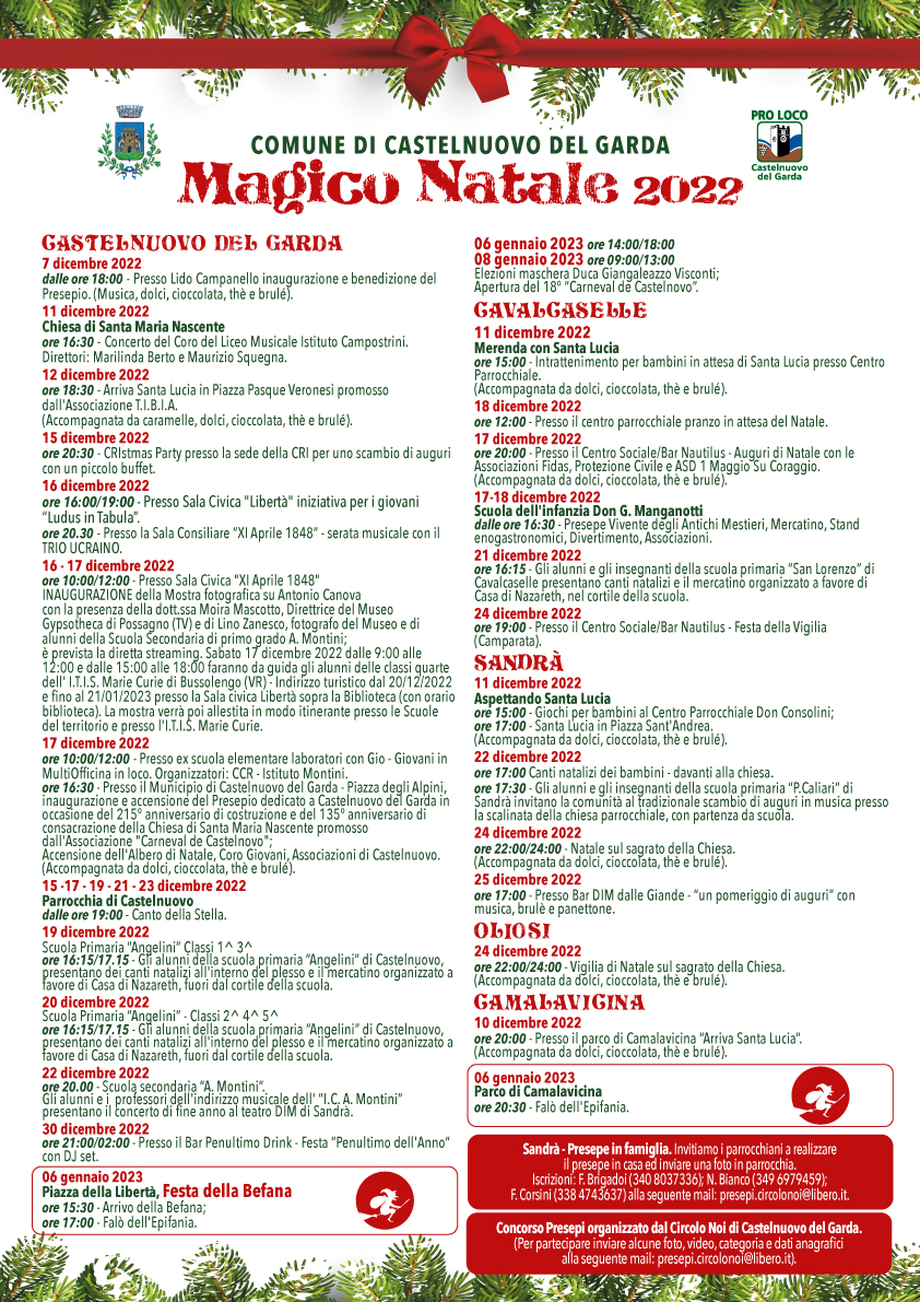 ore 16:30 - Presso il Municipio di Castelnuovo del Garda - Piazza degli Alpini, inaugurazione e accensione del Presepio dedicato a Castelnuovo del Garda in occasione del 215° anniversario di costruzione e del 135° anniversario di consacrazione della Chiesa di Santa Maria Nastente promosso dall'Associazione "Carneval de Castelnovo";